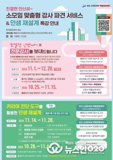 ‘맞춤형 강사파견 서비스’는 오는 25일부터 11월 15일까지 안산 스마트허브 복합문화센터 누리집에서 접수할 수 있고 ‘인생 재설계 특강’은 오는 28일부터 11월 6일까지 가능하다.