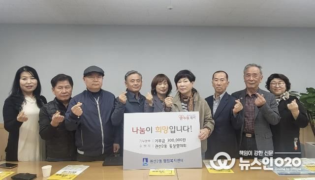 (뉴스인020 = 박용우 기자) 수원시 권선구 권선2동 통장협의회는 지난 4일 권선2동 행정복지센터에서 관내 어려운 이웃을 위한 기부금 전달식을 개최했다.
