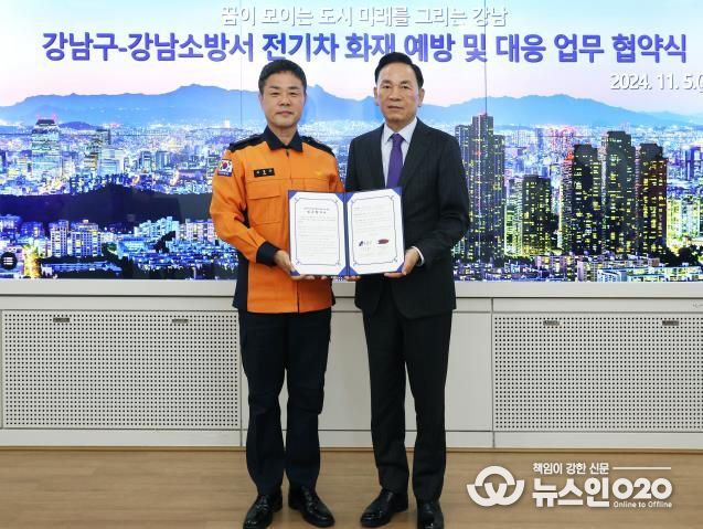(뉴스인020 = 박용우 기자) 꿈이 모이는 도시, 미래를 그리는 강남구가 5일 구청에서 강남소방서(서장 김흥곤)와 전기차 화재 예방 및 대응을 위해 협약을 체결했다.