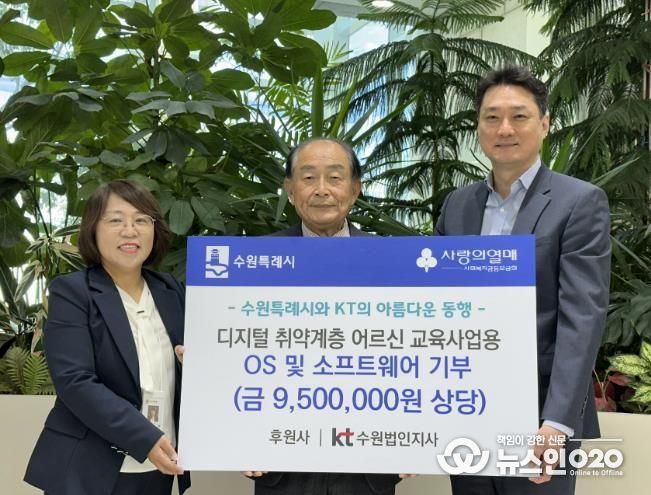 (뉴스인020 = 박용우 기자) KT가 7일 “디지털 취약계층을 위해 사용해 달라”며 수원시 디지털배움터 교육장을 운영하는 ‘(사)한국복지정보통신협의회 경기지부’에 950만원 상당의 컴퓨터 운영체제(OS) 등 프로그램을 기부했다.