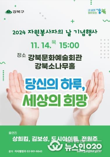 (뉴스인020 = 박용우 기자) 서울 강북구는 자원봉사자의 날(12월 5일)을 맞아 오는 14일 오후 3시 강북문화예술회관 강북소나무홀에서 “당신의 하루, 세상의 희망‘이라는 슬로건으로 자원봉사자의 날 기념행사를 개최한다.