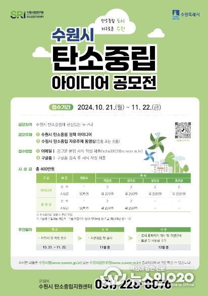 (뉴스인020 = 박용우 기자) 수원시 탄소중립지원센터가 11월 22일까지 ‘탄소중립 아이디어 공모전’을 연다.