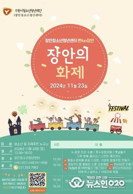 (뉴스인020 = 박용우 기자) 수원시청소년청년센터는 11월 23일 오후 1시 30분 장안청소년청년센터에서 지역주민과 청소년이 함께 만드는 축제 뻔FUN 장안 11월‘장안의 화제’를 개최한다고 밝혔다.