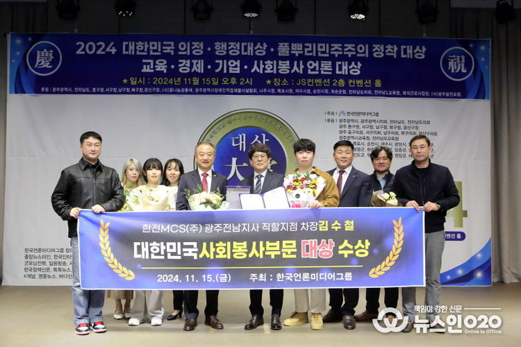 (뉴스인020 = 김성길 기자) 2024년 11월 15일, 광주 서구 상무지구 JS컨벤션 2층에서 열린 공법단체 한국언론미디어그룹의 8주년 기념식 및 대한민국 의정대상 시상식에서 한전MCS(주) 김수철 차장이 사회봉사부문에서 수상했다.