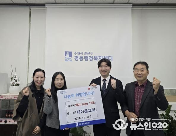 (뉴스인020 = 박용우 기자) 수원시 권선구 새이룸교회에서는 지난 20일 추수감사절을 맞이하여 백미 10kg 12포를 평동 행정복지센터에 전달했다.