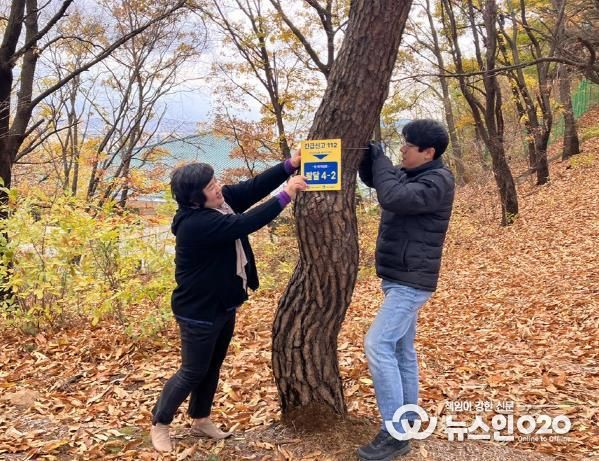 (뉴스인020 = 박용우 기자) 수원시 팔달구는 지난 27일, 안전한 산책로를 조성하고자 팔달산 산책로 수목에 112 신고 안내표지판을 확대 설치했다고 밝혔다.