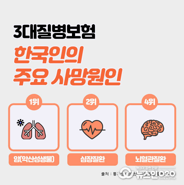 (뉴스인020 = 김성길 기자) 한국인의 주요 사망원인중에 암, 뇌혈관질환, 심혈관질환은 흔히 3대질병이라 일컬어지며 살아가면서 가장 먼저 대비해야 하는 중대질병으로 항상 강조되고 있다. 이들 질병에 미리 대비하기 위해 가입하는 것이 진단비보험인데, 이러한 3대질병진단비를 중점으로 보장하는 보장성보험이 3대진단비보험 이다. 3대질병진단비보험은 각각의 질병에 주목해서 보장하기도 하지만, 나에게 맞는 추가 특약을 잘 골라서 가입한다면 종합건강보험으로도 충분히 활용도가 높다.