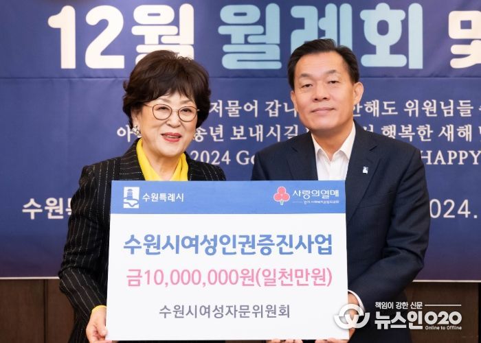 (뉴스인020 = 박용우 기자) 수원시 여성자문위원회가 “수원시 여성 권익 증진 사업에 사용해 달라”며 1000만 원을 수원시에 기부했다. 기부금은 경기도사회복지공동모금회 지정 기탁 방식으로 수원시 여성 권익 증진 사업에 사용할 예정이다.