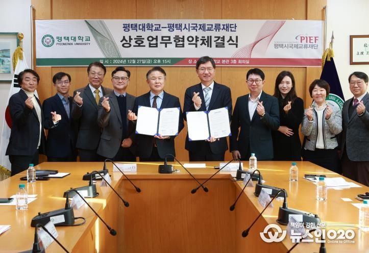 (뉴스인020 = 김성길 기자) 평택시국제교류재단과 평택대학교가 지난 12월 27일, 평택대학교 본관 회의실에서 국제교류 및 외국인 지원 활성화를 위한 업무협약(MOU)을 체결했다. 이번 협약은 평택시 관내 외국인 주민과 유학생들의 안정적인 생활 정착 지원, 국제교류 활성화, 그리고 주한미군 지원 확대 등을 목적으로 진행됐다.