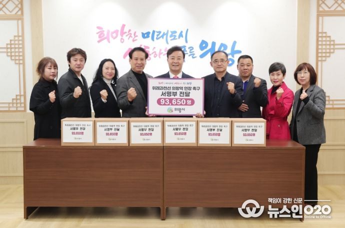 이에 김성제 시장은 “시민들의 자발적인 서명운동에 대해 감사드린다”면서 “의왕시 시민사회 각 계 각층의 염원을 국토교통부에 잘 전달하여 '제5차 국가철도망 구축계획'에 의왕연장안이 반드시 반영될 수 있도록 최선을 다하겠다”고 밝혔다.