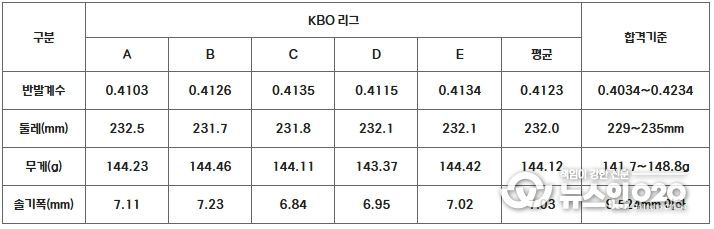 이번 검사는 KBO 리그 단일 경기사용구인 ㈜스카이라인스포츠 AAK-100의 샘플 5타를 무작위로 수거한 뒤 지난 3월 21일(금)부터 24일(월)까지 국민체육진흥공단(KSPO) 한국스포츠개발원 스포츠용품 시험소에 의뢰해 진행했다. 검사 결과, 모든 샘플이 합격기준을 충족한 것으로 확인됐다.