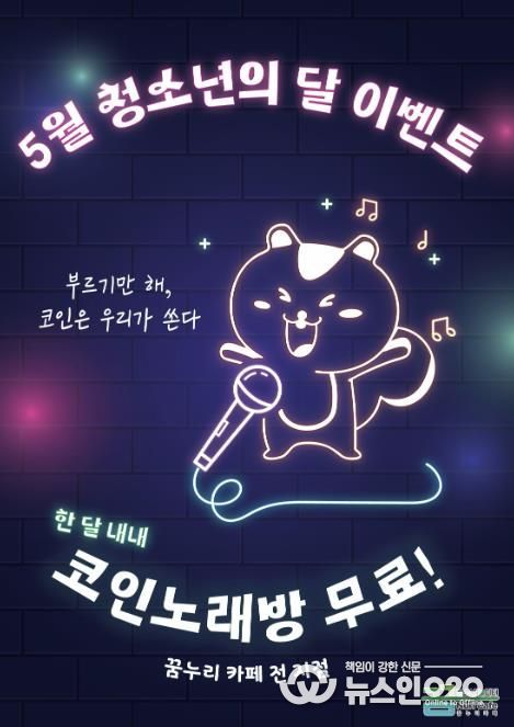 (뉴스인020 = 김성길 기자) 의왕시청소년재단 산하 의왕시청소년수련관 꿈누리카페는 5월 청소년의 달을 맞이하여 5월 한 달간 ‘코인노래방 무료 이용 이벤트’를 실시한다고 밝혔다.