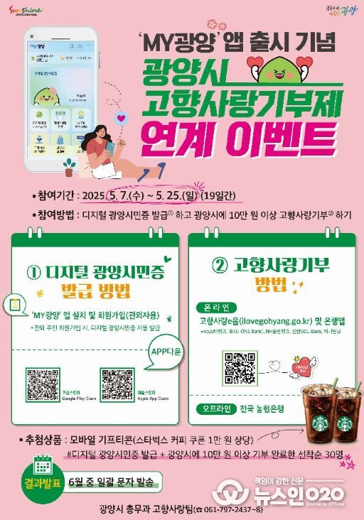 (뉴스인020 = 김성길 기자) 광양시는 디지털 종합 행정 플랫폼인 모바일 앱 ‘MY광양’ 출시를 기념해 ‘디지털 광양시민증’ 발급을 독려하고, 고향사랑기부제를 활성화하기 위한 연계 이벤트를 5월 7일부터 25일까지 진행한다고 7일 밝혔다.