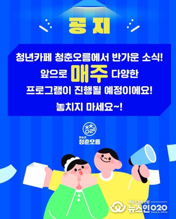 (뉴스인020 = 김성길 기자) 화순군은 19일 청년카페 ‘청춘오름’이 5월 20일부터 청년 누구에게나 쉬고, 즐길 수 있는 공간으로 대변신할 예정이라고 밝혔다.