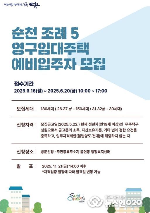 (뉴스인020 = 김성길 기자) 순천시는 주거 취약계층의 주거복지 수요 증가에 대응하기 위해 ‘순천조례5차 영구임대주택’ 예비입주자 180세대를 모집한다.
