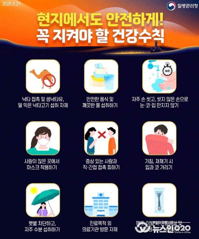 특히, 중동 지역에서는 메르스가 지속 발생하고 있어, 이슬람 하지(HAJJ) 성지순례 기간(2025년 6월 4일~9일)에 참여하거나 해당 기간 중 사우디아라비아를 방문하는 여행객은 현지에서 낙타 접촉, 생낙타유 및 덜 익힌 낙타고기 섭취, 진료 목적 외 의료기관 방문 자제 등 각별한 주의가 필요하다.