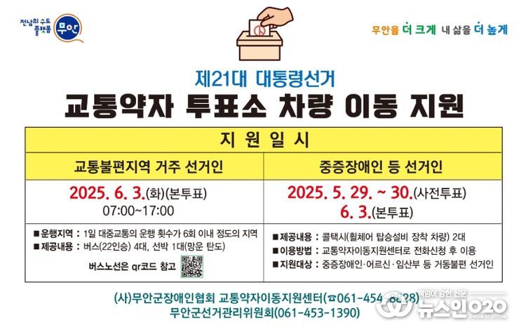 (뉴스인020 = 김성길 기자) 전남 무안군은 제21대 대통령선거를 앞두고 무안군 선거관리위원회와 협력해 교통이 불편한 지역유권자들의 원활한 투표 참여를 돕기 위한 교통편의 대책을 마련했다.