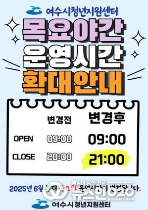 (뉴스인020 = 김성길 기자) 여수시는 6월부터 청년지원센터 ‘목요 야간 운영’을 오후 9시까지 1시간 연장한다고 밝혔다.