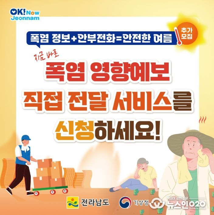 (뉴스인020 = 김성길 기자) 전라남도는 오는 9월 30일까지를 폭염대책 기간으로 정하고, 인명과 재산 피해 최소화를 위한 2025년 폭염대응 종합계획을 세워 추진한다고 밝혔다.