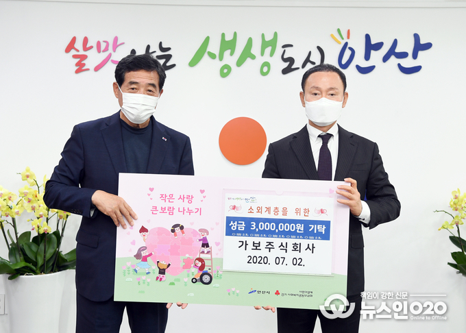 (뉴스인020 = 김성길 기자) 안산시(시장 윤화섭)는 2일 가보주식회사로부터 사랑의 후원금 300만원을 기탁 받아 코로나바이러스감염증-19(코로나19) 사태로 어려움을 겪고 있는 관내 저소득가정을 돕는데 사용하기로 했다.
