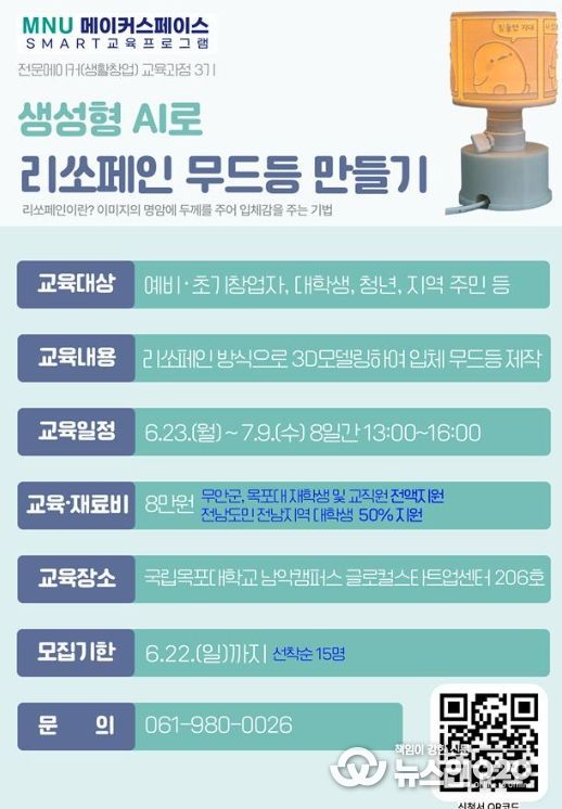 (뉴스인020 = 김성길 기자) 전남 무안군의 지원을 받아 운영되는 국립목포대학교 창업혁신센터는 오는 23일부터 남악캠퍼스 MNU메이커스페이스 전문랩 시제품제작실에서 대학생과 주민을 대상으로 ‘전문메이커 교육과정 3기’를 운영한다고 밝혔다.