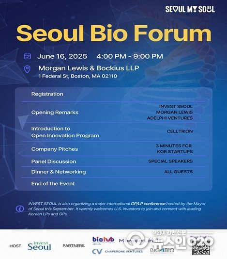 올해 행사에는 서울시 투자유치 전담조직인 ‘인베스트서울(Invest Seoul)’이 박람회 첫날인 16일 오후 4시(현지시간)에 ‘서울바이오포럼(Seoul Bio Forum 2025)’을 개최한다. 이번 포럼에는 글로벌 반도체‧AI기업 엔비디아를 비롯해 화이자, 아스트라제네카, 오비메드, 메이요 클리닉 등 글로벌 기업 및 기관 관계자 100여 명이 참석해 서울 바이오 스타트업 10개사의 IR 발표와 네트워킹에 참여한다.