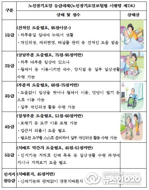 (뉴스인020 = 김나현 기자) 현(現) 장기요양수급자인 65세 이상 어르신 및 65세 미만 노인성 질환자의 장기요양 등급 갱신 유효기간이 기존 2년(갱신 후 동일 등급이면 1등급 4년, 2~4등급 3년으로 연장)에서 1등급은 5년, 2~4등급은 4년으로 연장된다.