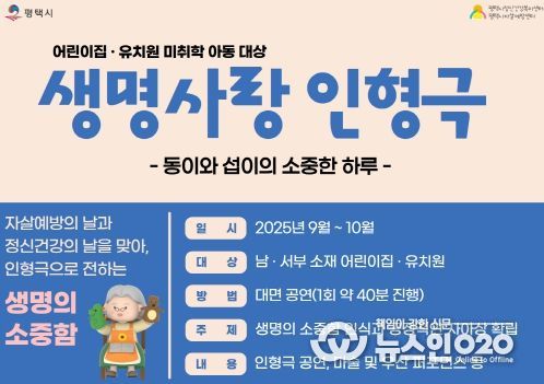 (뉴스인020 = 김성길 기자) 평택시는 자살예방의 날(9.10.)과 정신건강의 날(10.10.)을 맞아 오는 9월부터 10월까지 미취학 아동 약 400명을 대상으로 생명의 소중함을 알리는 ‘생명사랑 인형극’ 순회공연을 운영한다고 밝혔다.