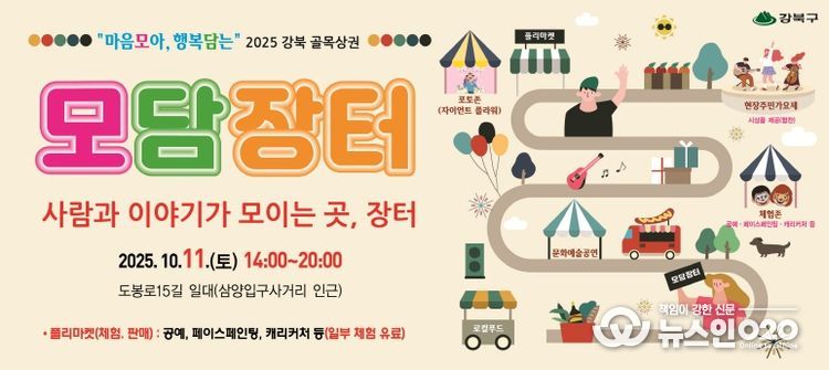 (뉴스인020 = 김성길 기자) 서울 강북구는 오는 11일 오후 2시부터 8시까지 삼양입구사거리 인근 도봉로15길 일대에서 ‘2025 강북 골목상권 모담장터’를 개최한다고 밝혔다.