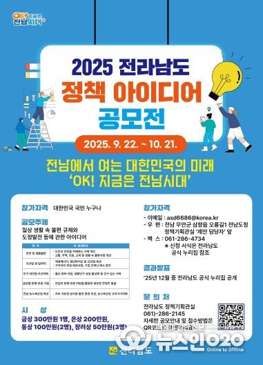 (뉴스인020 = 김성길 기자) 전라남도가 새 정부의 실용주의 기조에 맞춰 ‘생활 속 불편을 찾고 이를 개선할, 지역의 미래를 먹여 살릴 정책’을 주제로 ‘2025년 전라남도 정책 아이디어 공모전’을 개최한다.