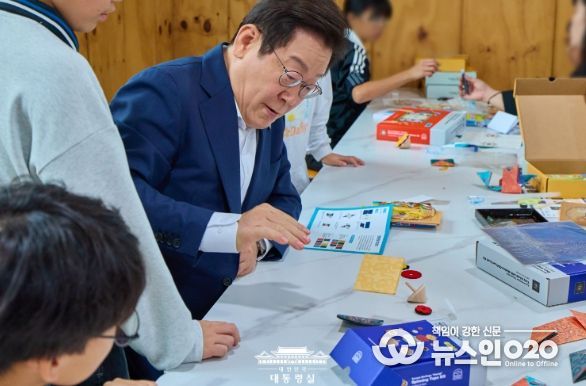 이어 명절을 맞아 딱지, 팽이 등 전통 장난감 만들기 체험을 하고 있던 아이들을 만난 이재명 대통령은 아이들과 일일이 하이파이브를 하며 인사를 나누고, 놀이를 함께했다.