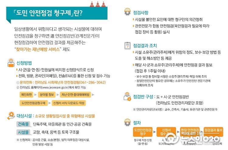 (뉴스인020 = 김성길 기자) 전라남도는 각종 재난으로부터 도민의 생명과 재산을 보호하고 일상 생활주변에 불안전한 위험요소를 찾아 무료로 안전점검하는 ‘도민 안전점검 청구제’를 운영하고 있다고 밝혔다.