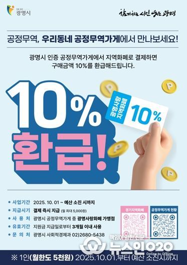 (뉴스인020 = 김성길 기자) 광명시가 공정무역가게에서 광명사랑화폐(지역화폐)로 결제하면 결제금액의 10%를 돌려주는 ‘공정무역 실천 캐시백’ 행사를 진행한다고 9일 밝혔다.