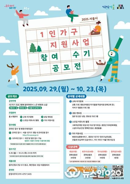 (뉴스인020 = 김성길 기자) 서울시가 1인가구 지원사업의 성과를 공유하고 참여자들의 생생한 목소리를 담아내기 위해 '2025년 1인가구 지원사업 참여 수기 공모전'을 개최한다.
