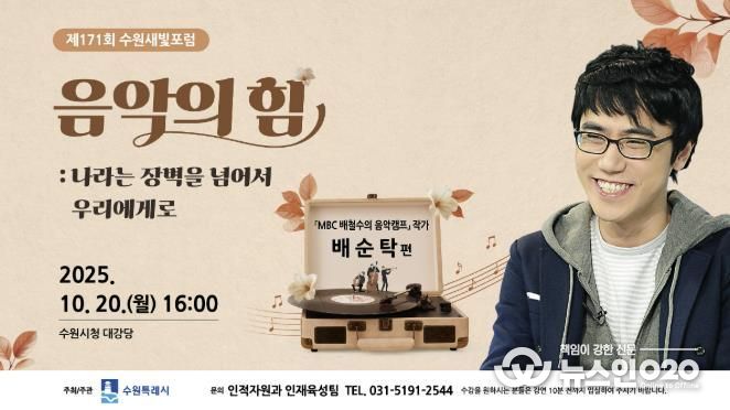 (뉴스인020 = 기자) MBC 라디오 ‘배철수의 음악캠프’ 배순탁 작가가 10월 20일 오후 4시 시청 대강당에서 열리는 제171회 수원새빛포럼 강사로 나선다.