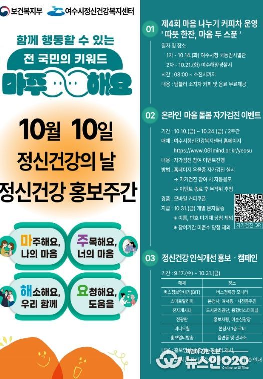(뉴스인020 = 김성길 기자) 여수시는 정신건강의 날(10월 10일)을 기념해 10월 10일부터 24일까지 ‘2025년 정신건강 홍보주간’을 운영한다.