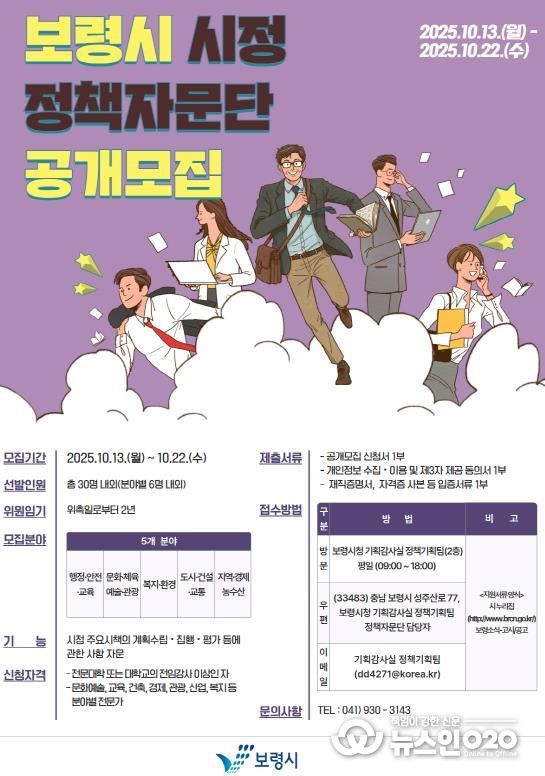 (뉴스인020 = 김성길 기자) 보령시는 지역 시정 발전에 대해 조언·권고·건의 등의 자문을 얻고자 보령시 시정 정책자문단 신규 위원을 10월 13일부터 22일까지 10일간 공개 모집한다고 밝혔다.