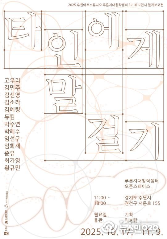 (뉴스인020 = 기자) 수원문화재단은 오는 10월 17일부터 11월 9일까지 약 3주간 탑동 시민농장에 자리한 수원아트스튜디오 푸른지대창작샘터에서 5기 레지던시 참여작가 13인의 올 한 해 작품 활동 성과를 공유하는 결과보고전 '타인에게 말 걸기'를 개최한다.