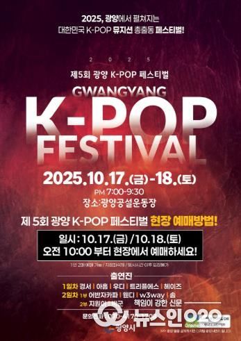(뉴스인020 = 김성길 기자) 제5회 광양 K-POP 페스티벌이 오는 17일과 18일, 광양공설운동장 일원에서 전국 청소년 댄스 경연대회와 함께 화려한 라인업으로 성대하게 개최된다.