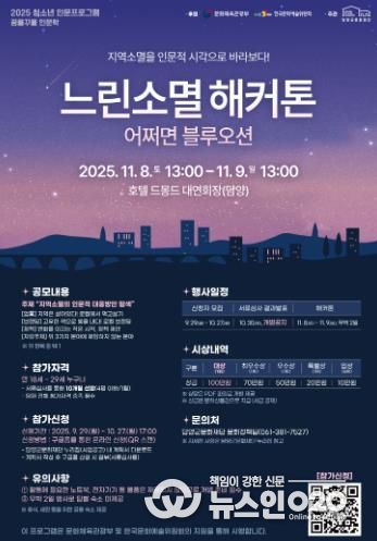 (뉴스인020 = 김성길 기자) 담양군문화재단은 오는 11월 8일부터 9일까지 지역소멸 대응 인문사회적 문제해결방안을 탐색하는 「느린소멸 해커톤」을 개최한다고 밝혔다.