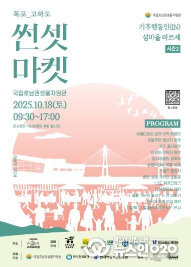 (뉴스인020 = 김성길 기자) 기후에너지환경부 산하 국립호남권생물자원관은 섬마을 주민들과 8개 기관 공동으로 ‘2025년 기후행동인(IN) 고하도 썬셋 마켓’을 10월 18일 오전 9시 30분부터 오후 5시까지 목포시 고하도에 자리 잡은 국립호남권생물자원관 야외정원에서 개최한다고 13일 밝혔다.