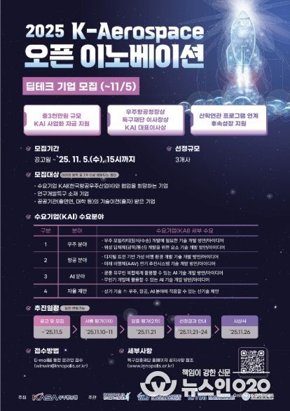 (뉴스인020 = 김나현 기자) 우주항공청은 10월 13일 우주항공청이 주최하고 한국항공우주산업㈜, 연구개발특구진흥재단, 진주강소특구(경상대학교), 한국항공우주연구원이 주관하는 '2025 K-Aerospace 오픈 이노베이션'을 추진하여 딥테크 기업을 육성할 계획이라고 밝혔다.