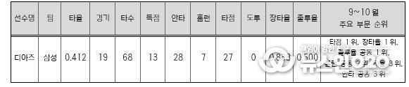 9~10월 MVP로 선정된 디아즈에게는 상금 300만원과 트로피가 전달될 예정이다.