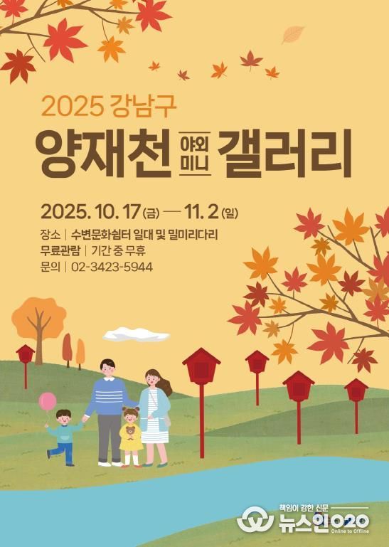 (뉴스인020 = 김성길 기자) 꿈이 모이는 도시, 미래를 그리는 강남구가 오는 10월 17일부터 11월 2일까지, 양재천 수변문화쉼터~밀미리교 구간 산책로에서 ‘양재천 미니 아트 갤러리’를 운영한다.