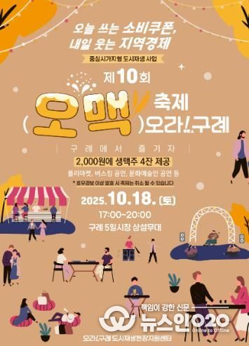 (뉴스인020 = 김성길 기자) 전남 구례군은 오는 10월 18일 오후 5시부터 8시까지 구례읍 5일시장 상설무대 일원에서 '제10회 오맥축제 오라! 구례, 구례에서 즐기자'를 개최한다고 밝혔다.