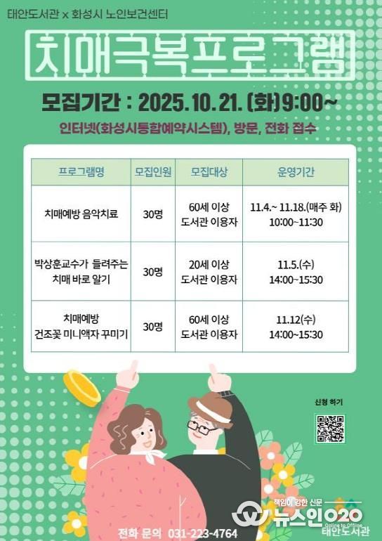 (뉴스인020 = 김성길 기자) 화성시문화관광재단 운영 화성시립태안도서관은 10월 14일부터 11월 18일까지 지역 어르신의 건강한 노년을 지원하기 위한 ‘치매극복 프로그램’을 운영한다.