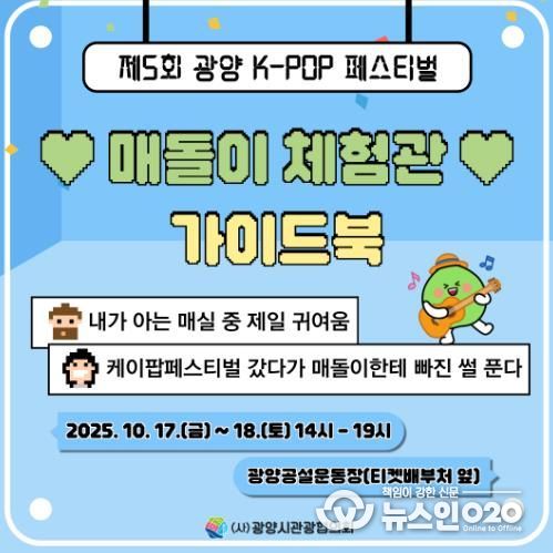 (뉴스인020 = 김성길 기자) 광양시는 ‘제5회 광양 K-POP 페스티벌’의 사전 열기를 확산하고 시민과 관광객이 함께 만들어가는 지속가능한 축제문화를 조성하기 위해 ‘매돌이 체험관’ 운영 및 ‘기대평 이벤트’를 추진한다고 밝혔다.