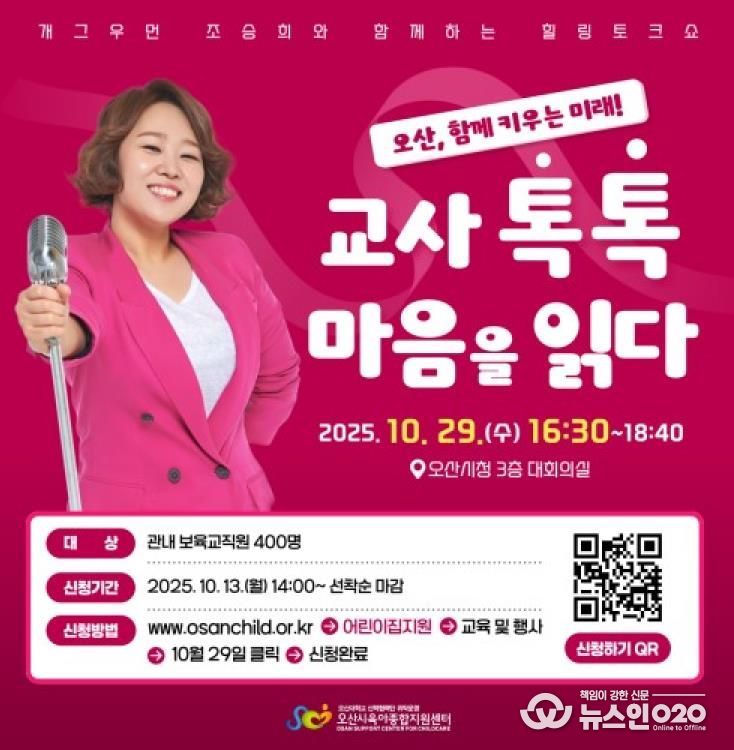 (뉴스인020 = 김성길 기자) 오산시육아종합지원센터는 개관 10주년을 맞아 오는 10월 29일, 오산시 영유아 부모 및 보육교직원을 대상으로 ‘오산, 함께 키우는 미래!’ 힐링 콘서트를 2회에 걸쳐 개최한다고 밝혔다.