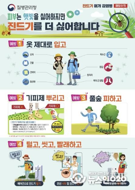 진드기 매개 감염병 예방을 위해서는 ▲야외 활동 시 진드기 기피제 사용 및 긴소매·긴바지·모자 등 착용으로 피부 노출 최소화 ▲야외활동 후 즉시 샤워 및 옷 갈아입기 ▲얼굴, 귀, 몸통 등에 진드기 부착 여부 확인 등의 수칙을 지켜야 한다.