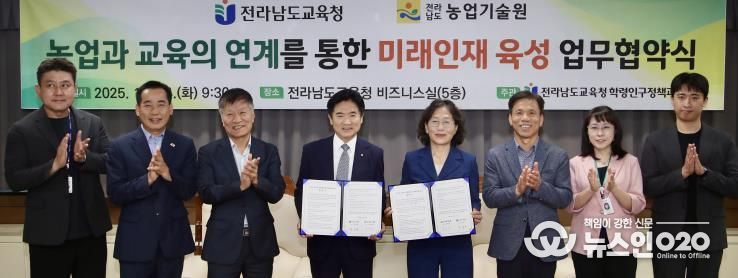 (뉴스인020 = 김성길 기자) 전라남도교육청은 10월 14일 청사 5층 비지니스실에서 전라남도 농업기술원(원장 김행란)과 ‘농업과 교육의 연계를 통한 미래인재 육성 업무협약’을 체결했다.